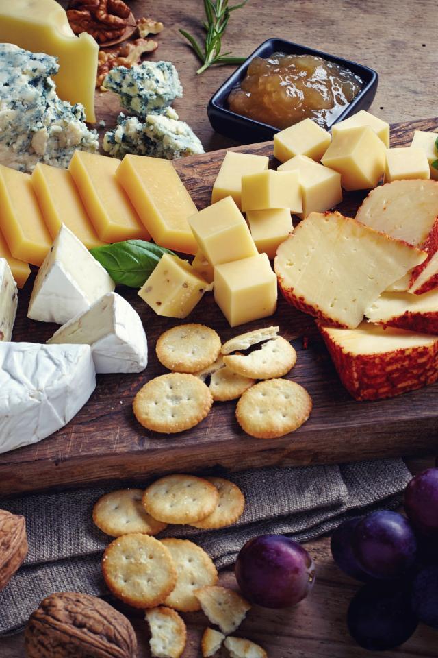 Обои Сырная нарезка на разделочной доске на столе с виноградом и крекерами