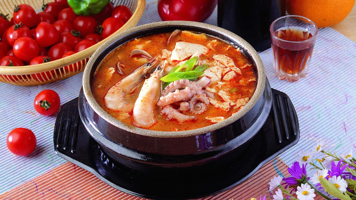 Обои Тарелка красного супа с морепродуктами на столе с овощами