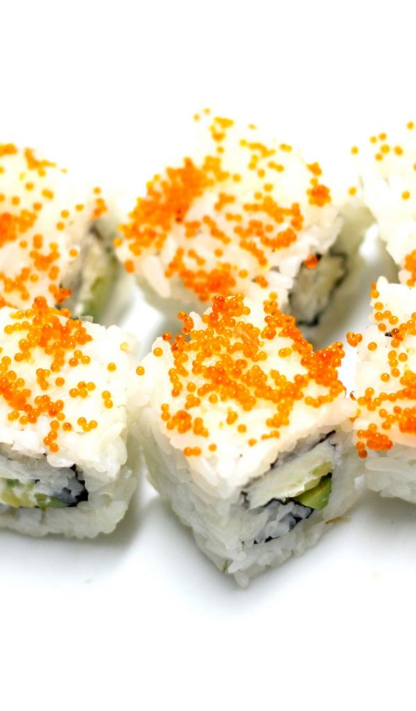 Обои Суши с с рисом и красной икрой на белом фоне
