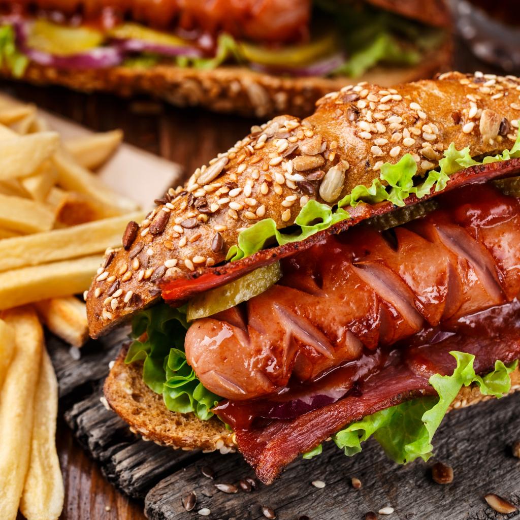 Обои Хотдог с сосиской и беконом на столе с картофелем фри