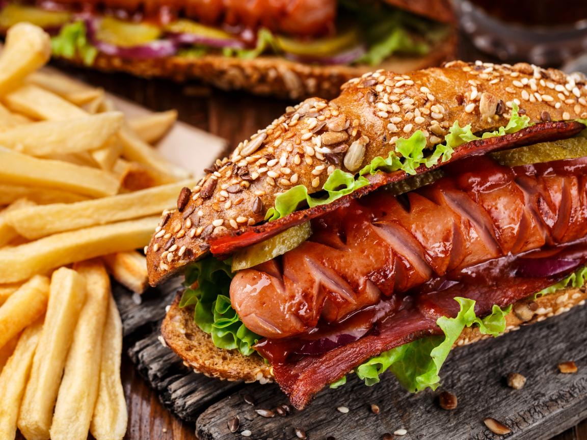 Обои Хотдог с сосиской и беконом на столе с картофелем фри