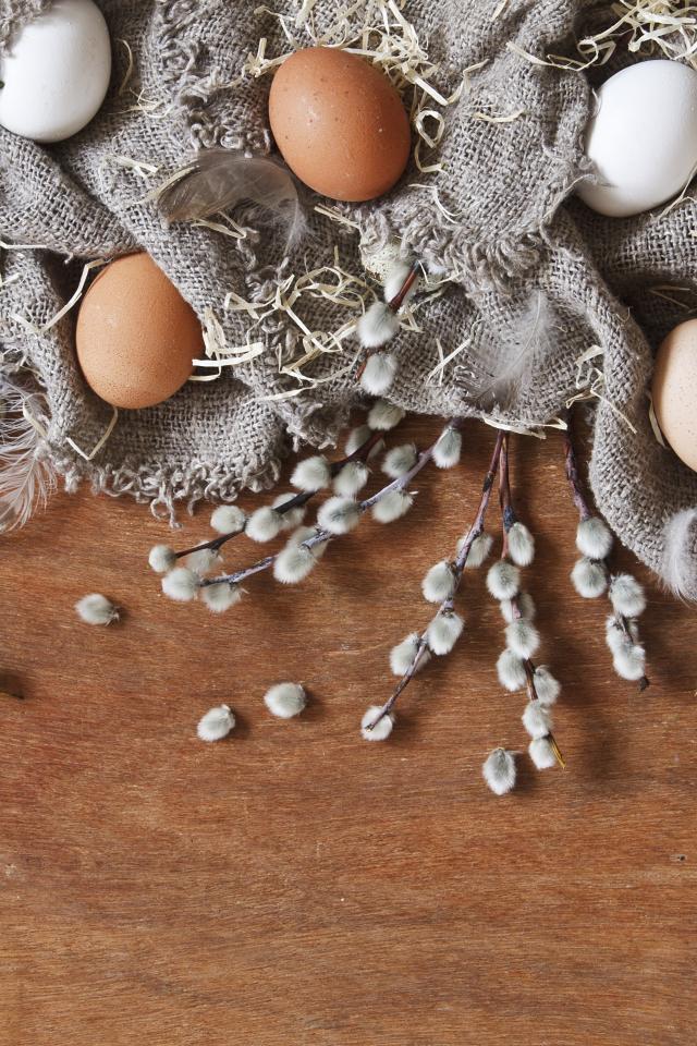 Обои Куриные и перепелиные яйца на столе в ветками вербы