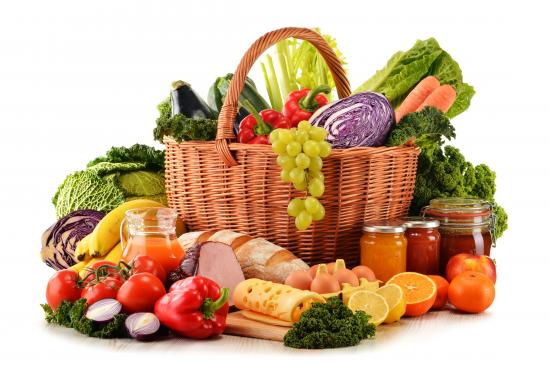 Обои Корзина с овощами и продуктами питания на белом фоне