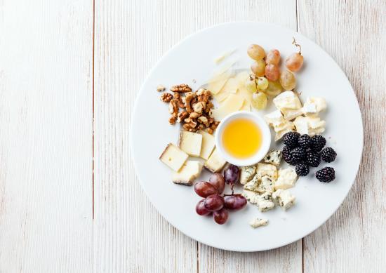 Обои Куски сыра на тарелке с орехами, виноградом, медом и ягодами ежевики