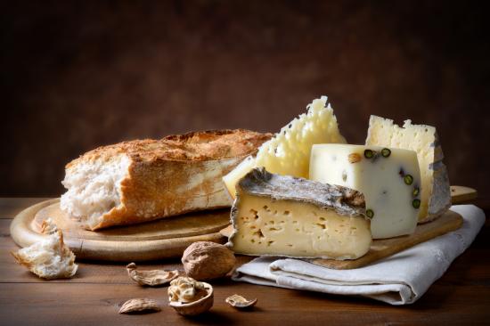 Обои Разные виды сыра на столе батоном и грецкими орехами