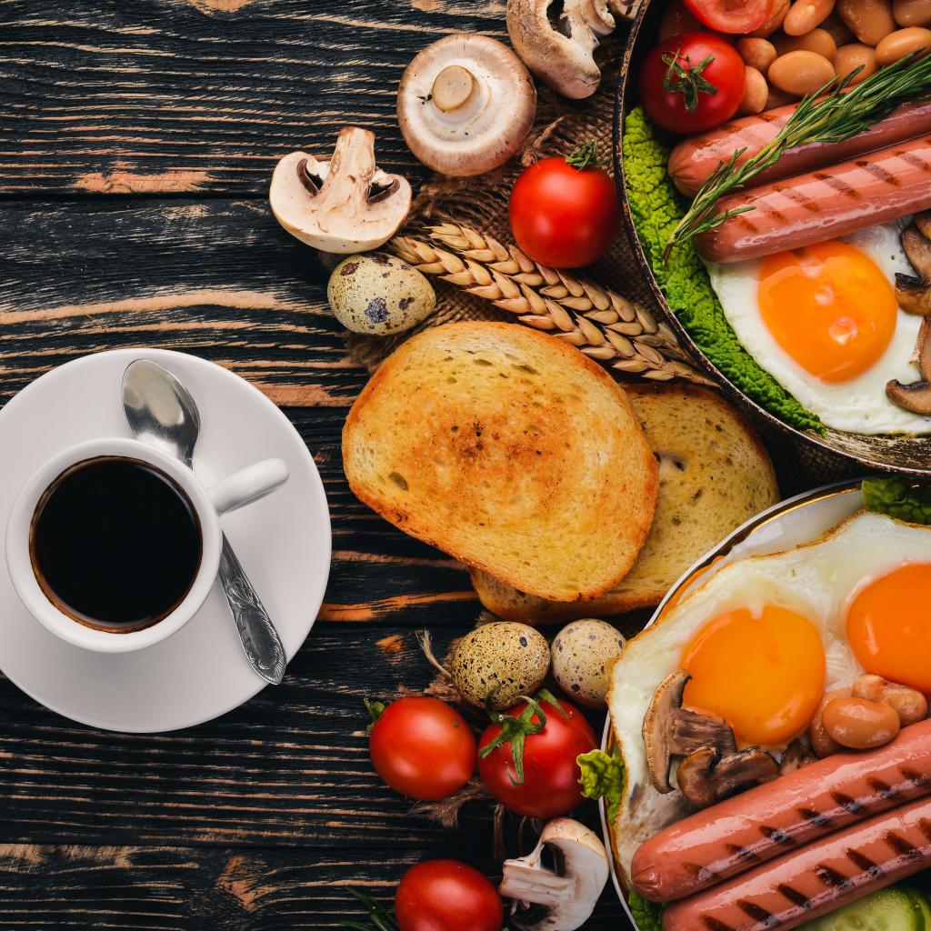 Обои Сырный вкусный завтрак на столе с кофе