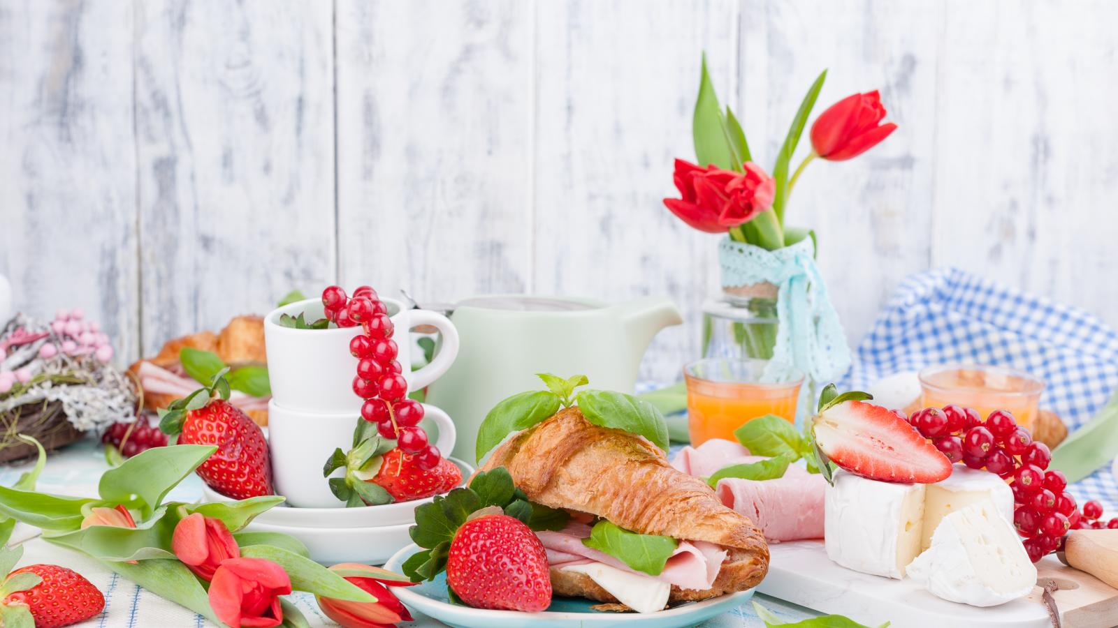 Обои Сытный завтрак на столе с цветами тюльпана