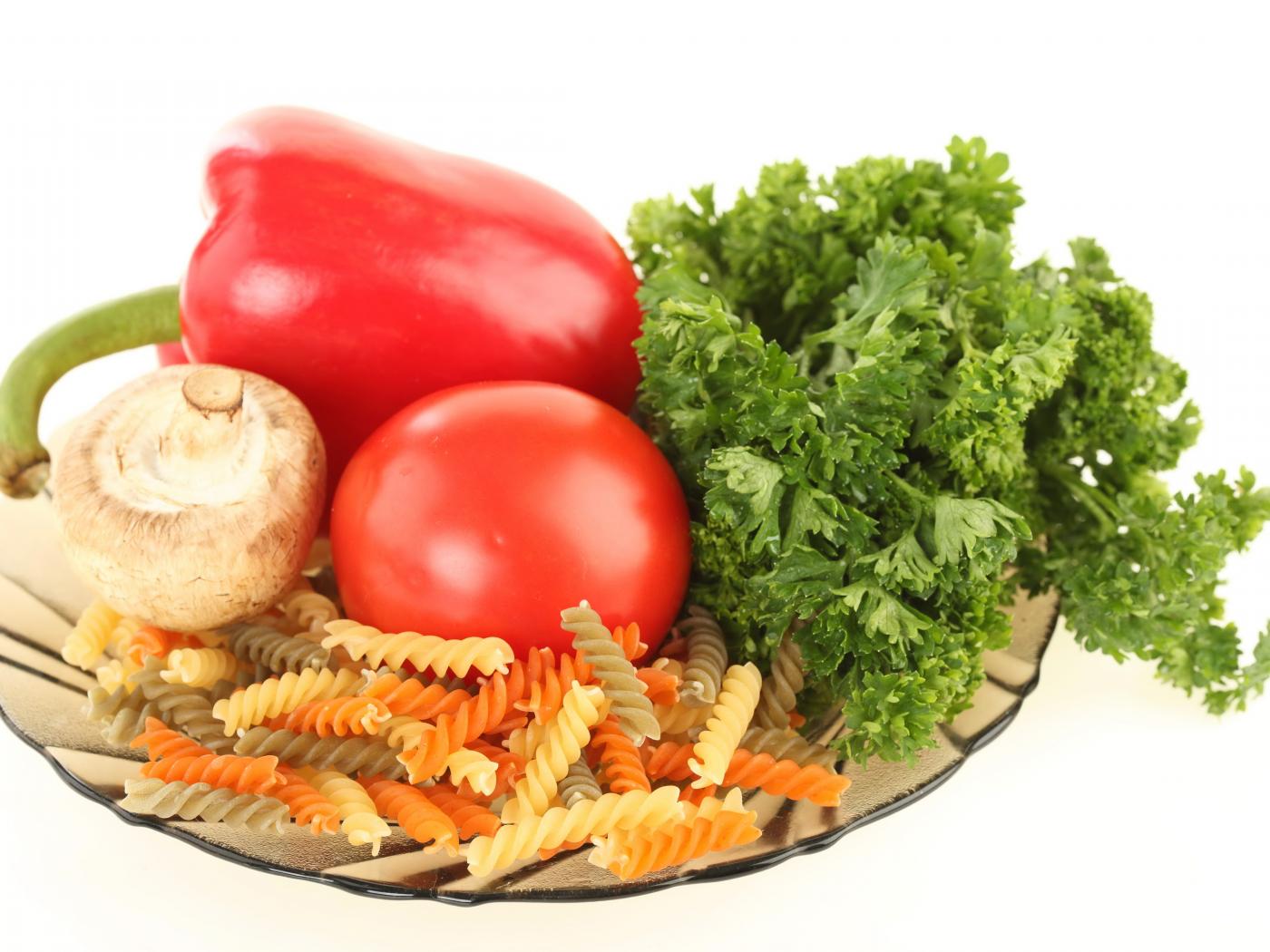 Обои Тарелка с макаронами, красным перцем, помидором, шампиньоном и зеленью петрушки