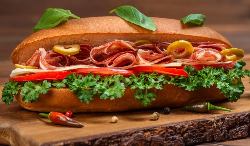 Обои Хот дог с ветчиной, помидорами и листьями петрушки