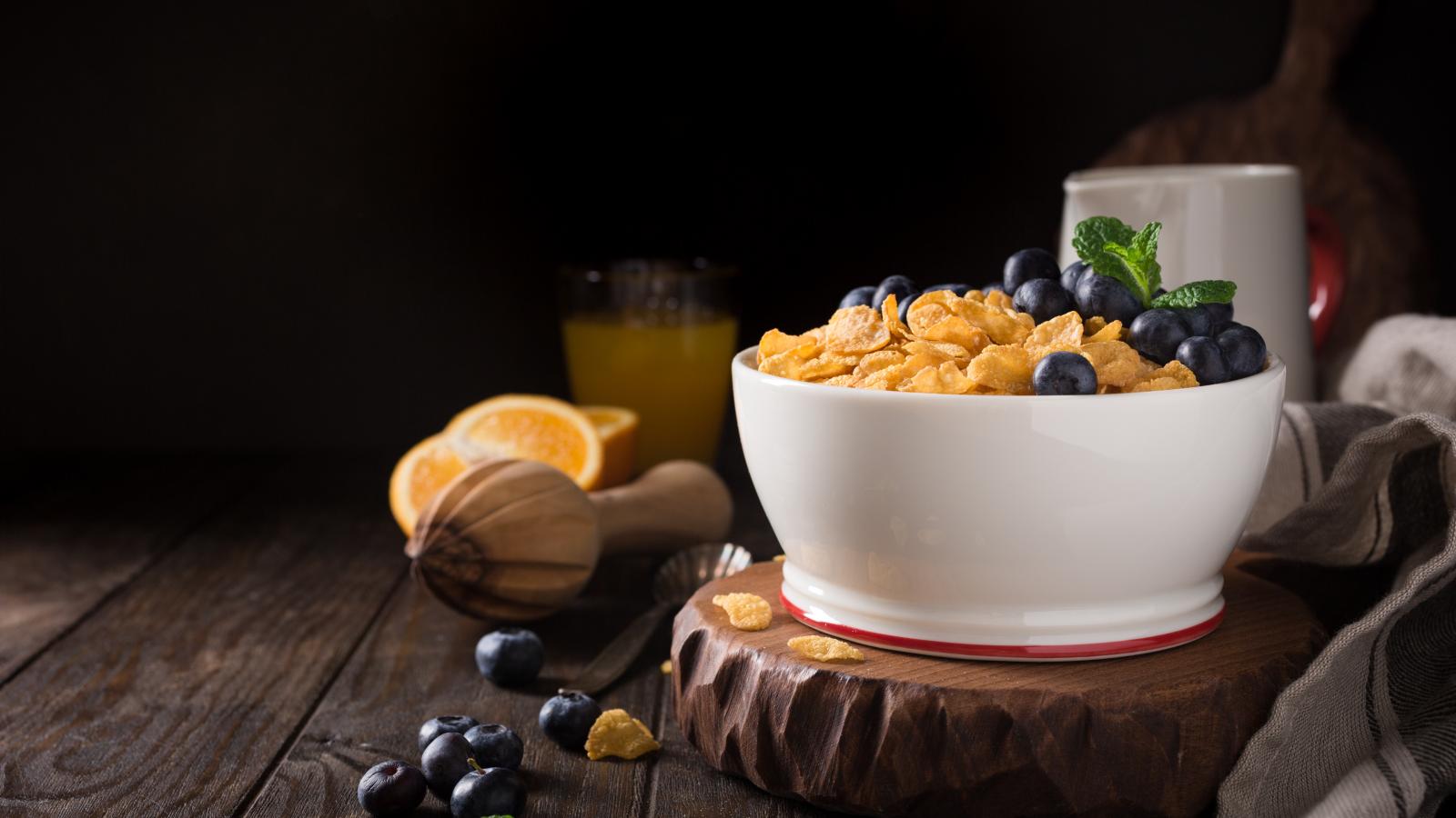 Обои Кукурузные хлопья в тарелке с ягодами черники