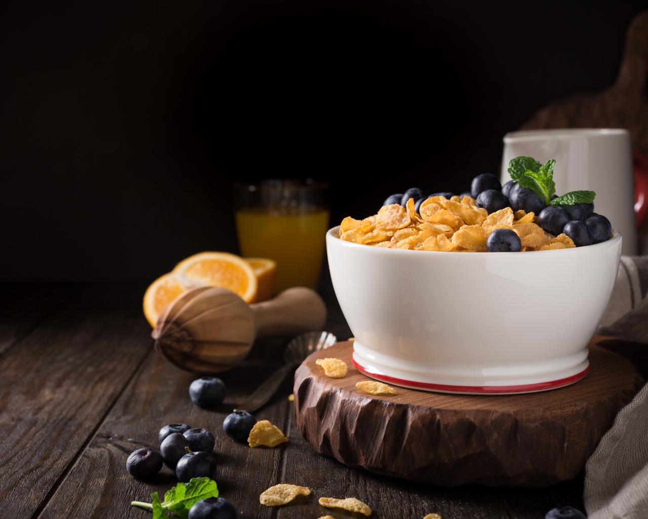 Обои Кукурузные хлопья в тарелке с ягодами черники