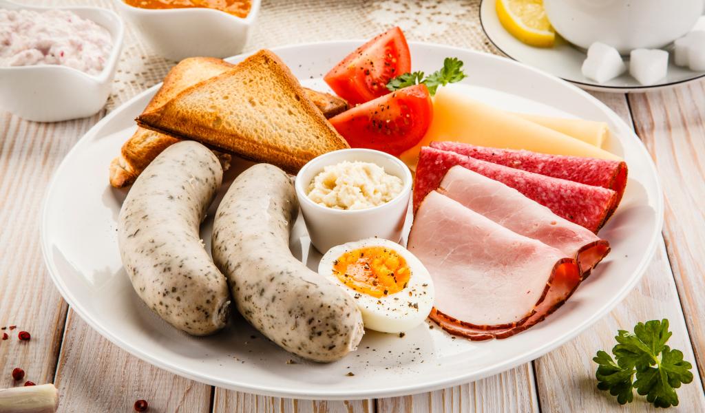 Обои Большая белая тарелка с колбасой, яйцами, помидорами, тостами и сыром