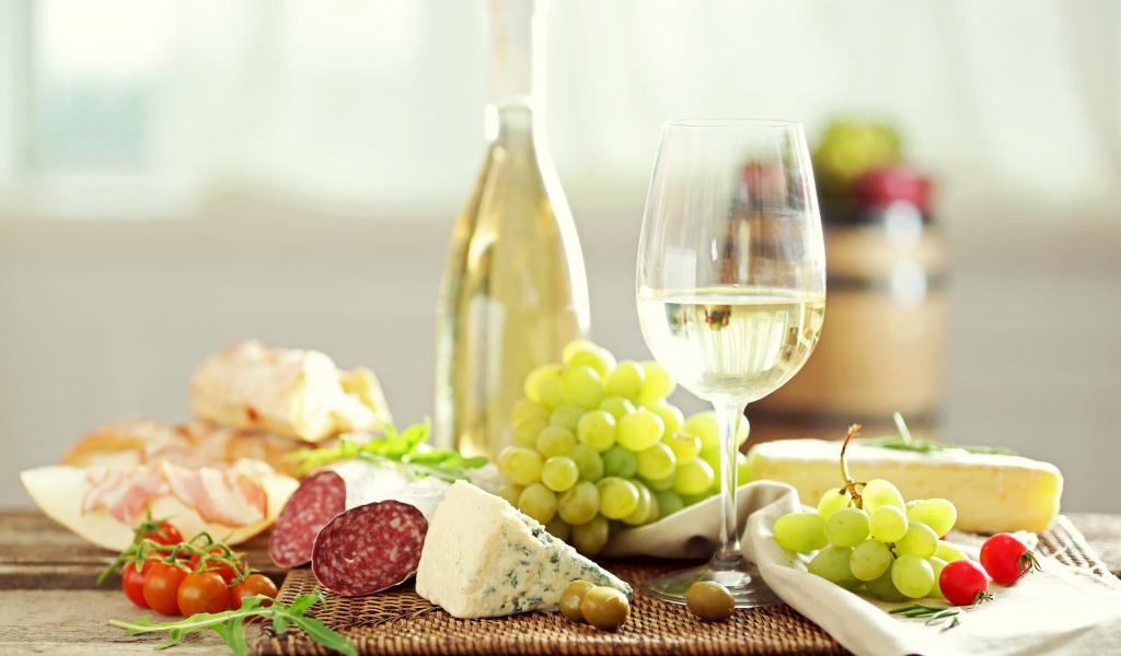 Обои Белое вино на столе с сыром, колбасой и виноградом