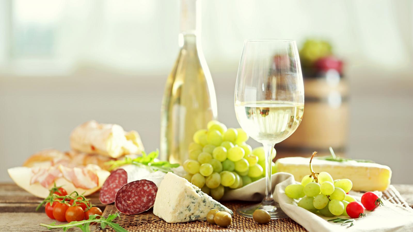 Обои Белое вино на столе с сыром, колбасой и виноградом