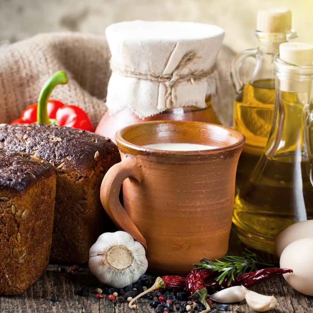 Обои Молоко, масло, специи, хлеб и яйца на столе
