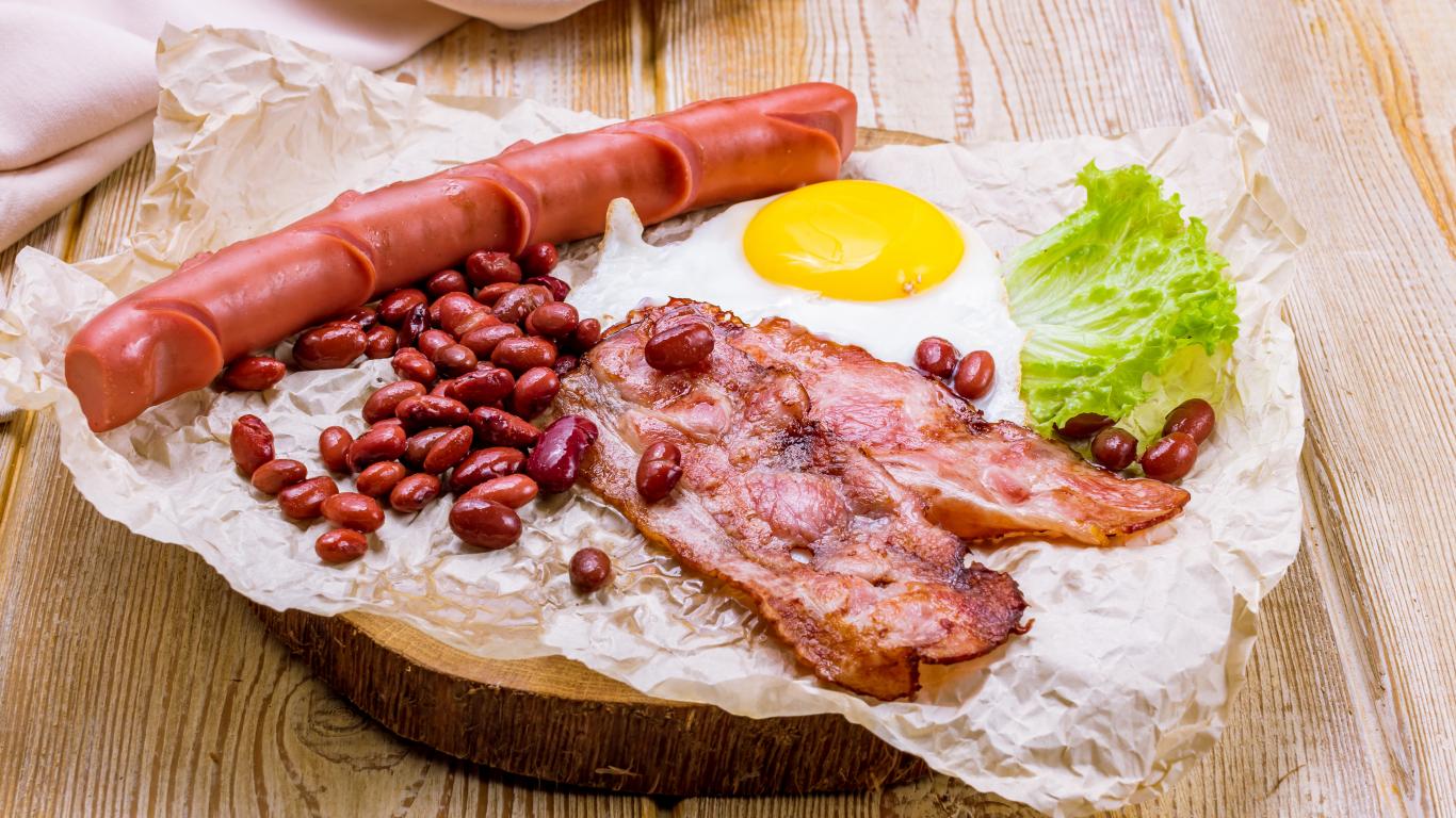 Обои Яичница с беконом, сосиской и фасолью