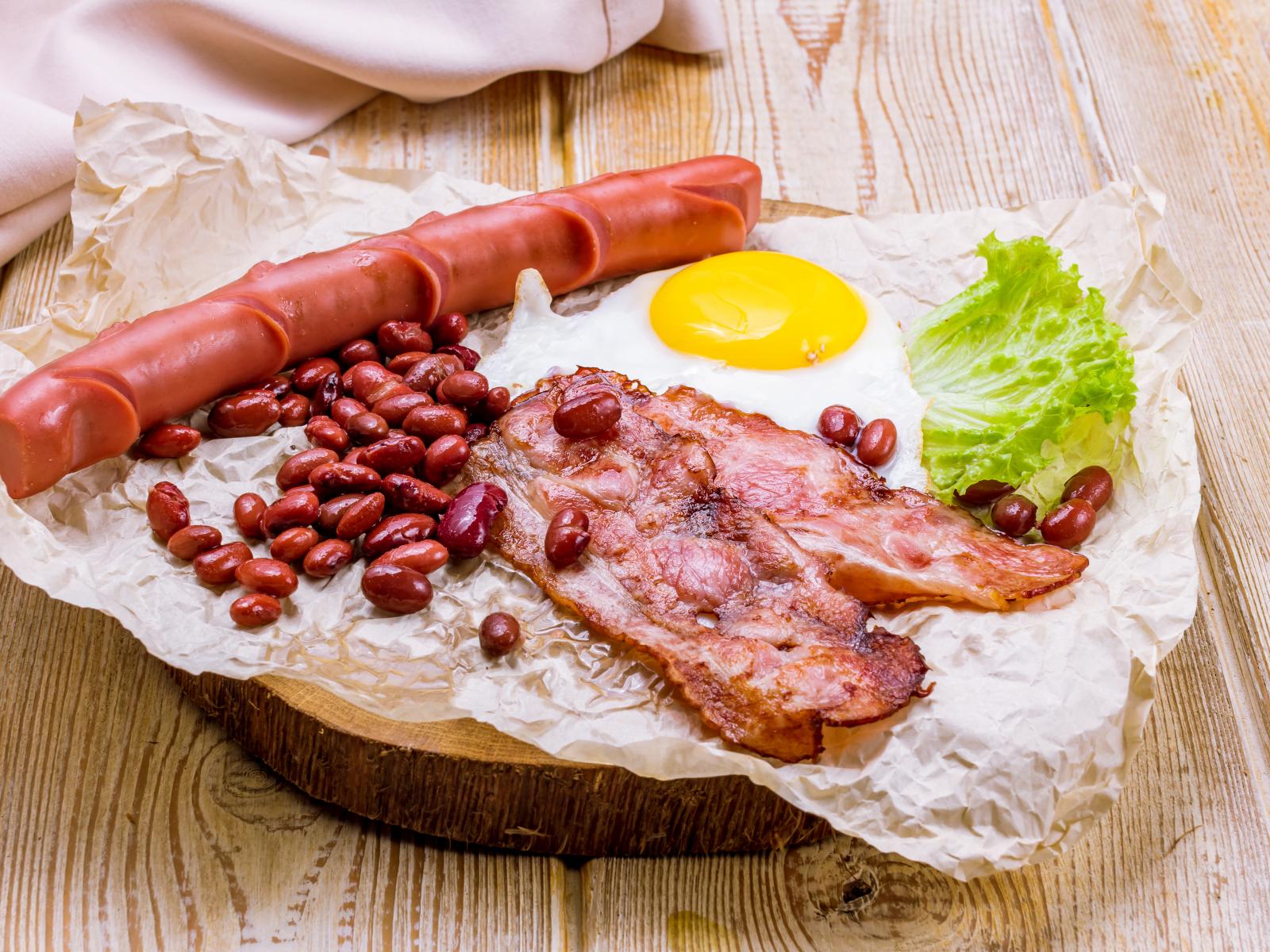 Обои Яичница с беконом, сосиской и фасолью