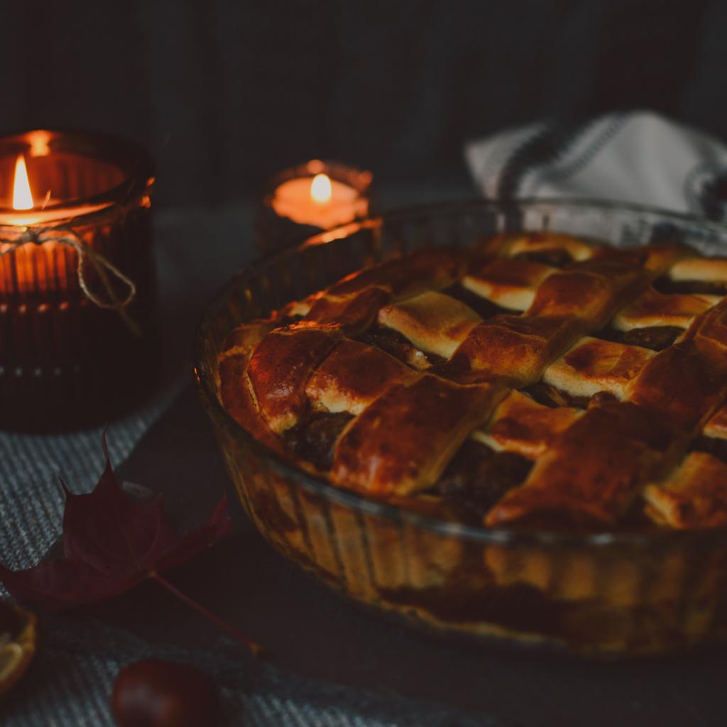 Обои Вкусный пирог с мясом на столе со свечами