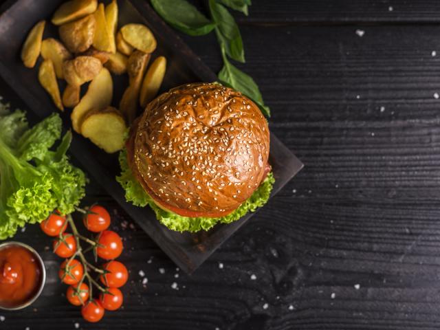 Обои Гамбургер с картофелем на столе с помидорами
