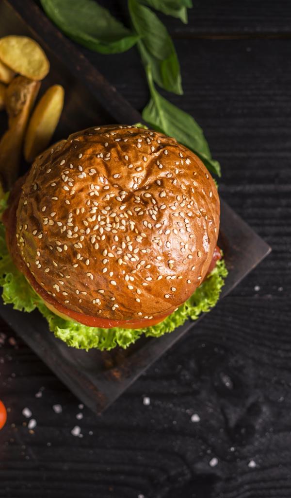 Обои Гамбургер с картофелем на столе с помидорами
