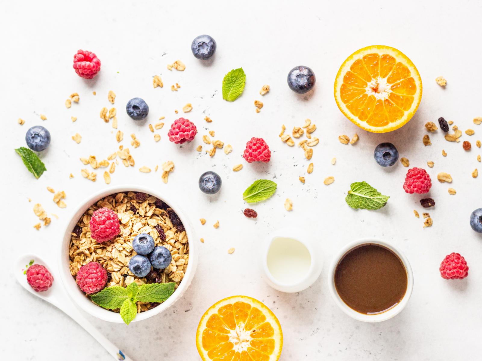 Обои Мюсли с ягодами на столе с шоколадом и апельсином