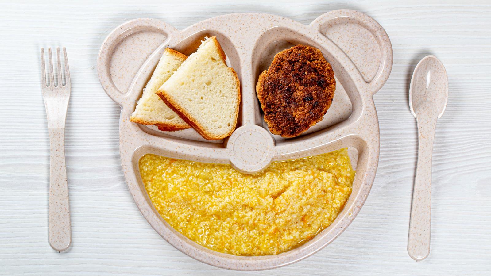 Обои Каша на тарелке с котлетой и хлебом для ребенка