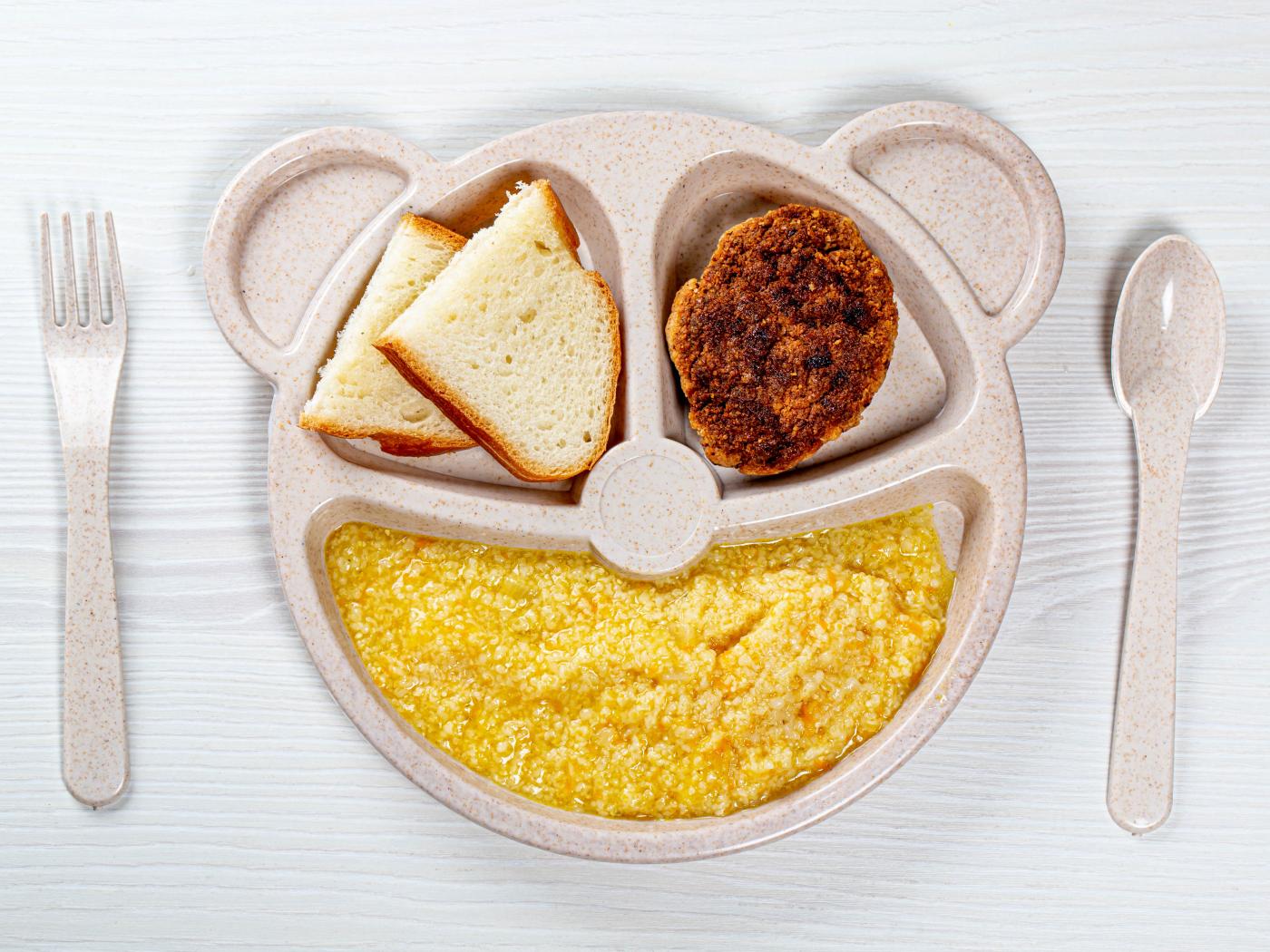 Обои Каша на тарелке с котлетой и хлебом для ребенка