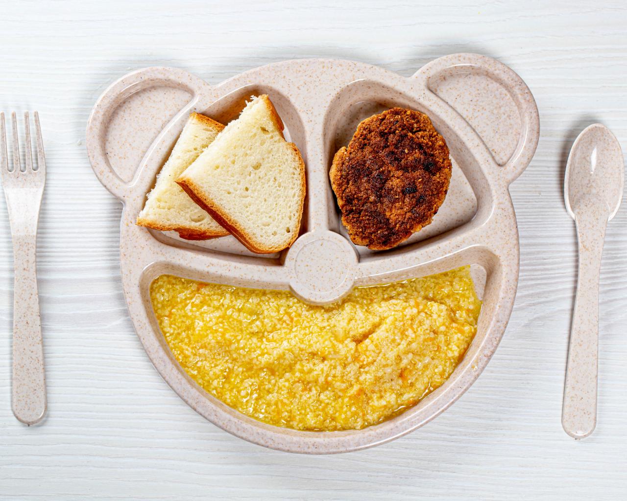Обои Каша на тарелке с котлетой и хлебом для ребенка