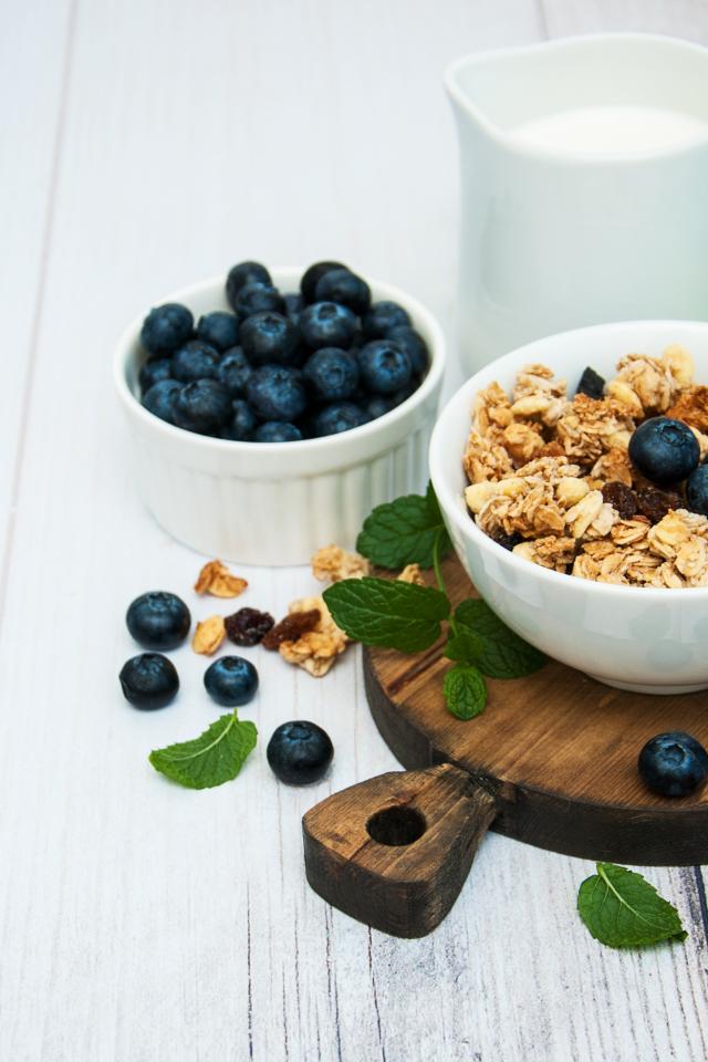 Обои Хлопья с ягодами черники на столе с молоком