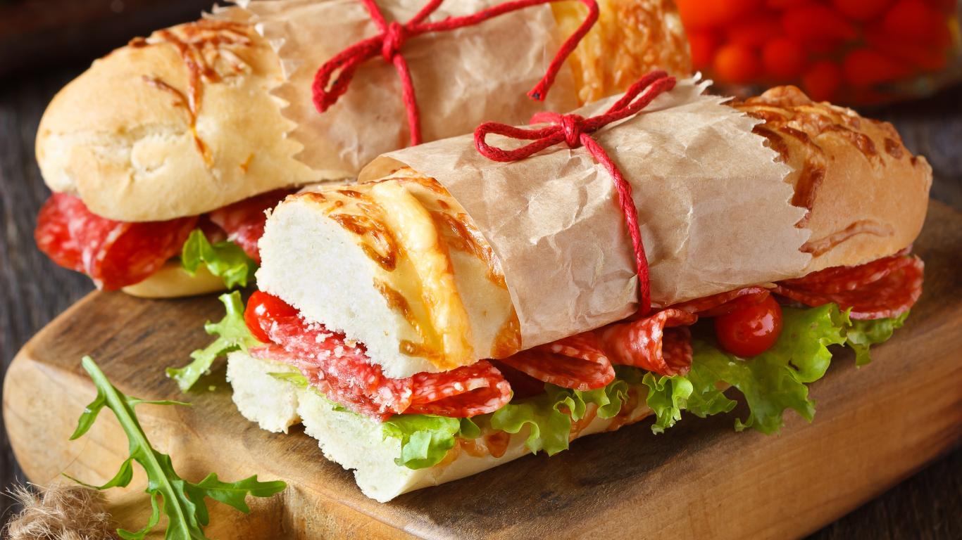 » Обои Два огромных бутерброда с колбасой и листьями салата