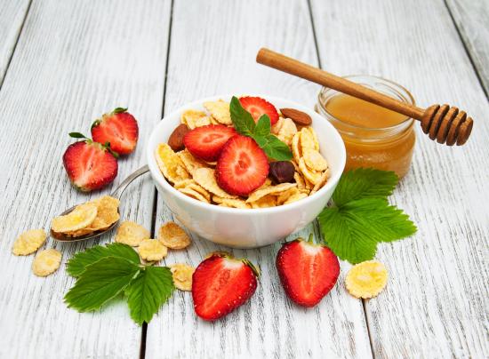 Обои Кукурузные хлопья в миске с клубникой и медом
