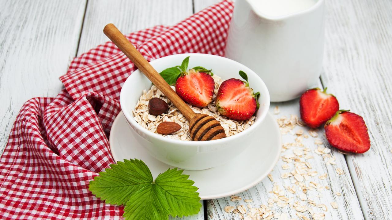 Обои Овсяные хлопья с молоком и свежей клубникой на завтрак