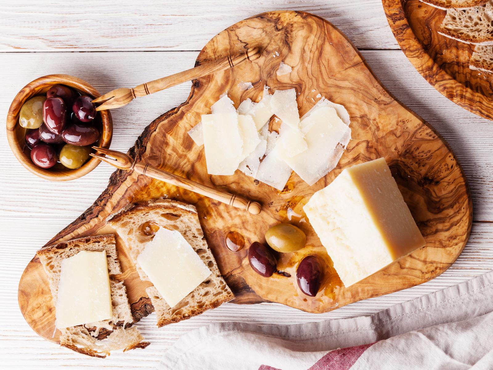 Обои Сыр на доске с хлебом и и оливками