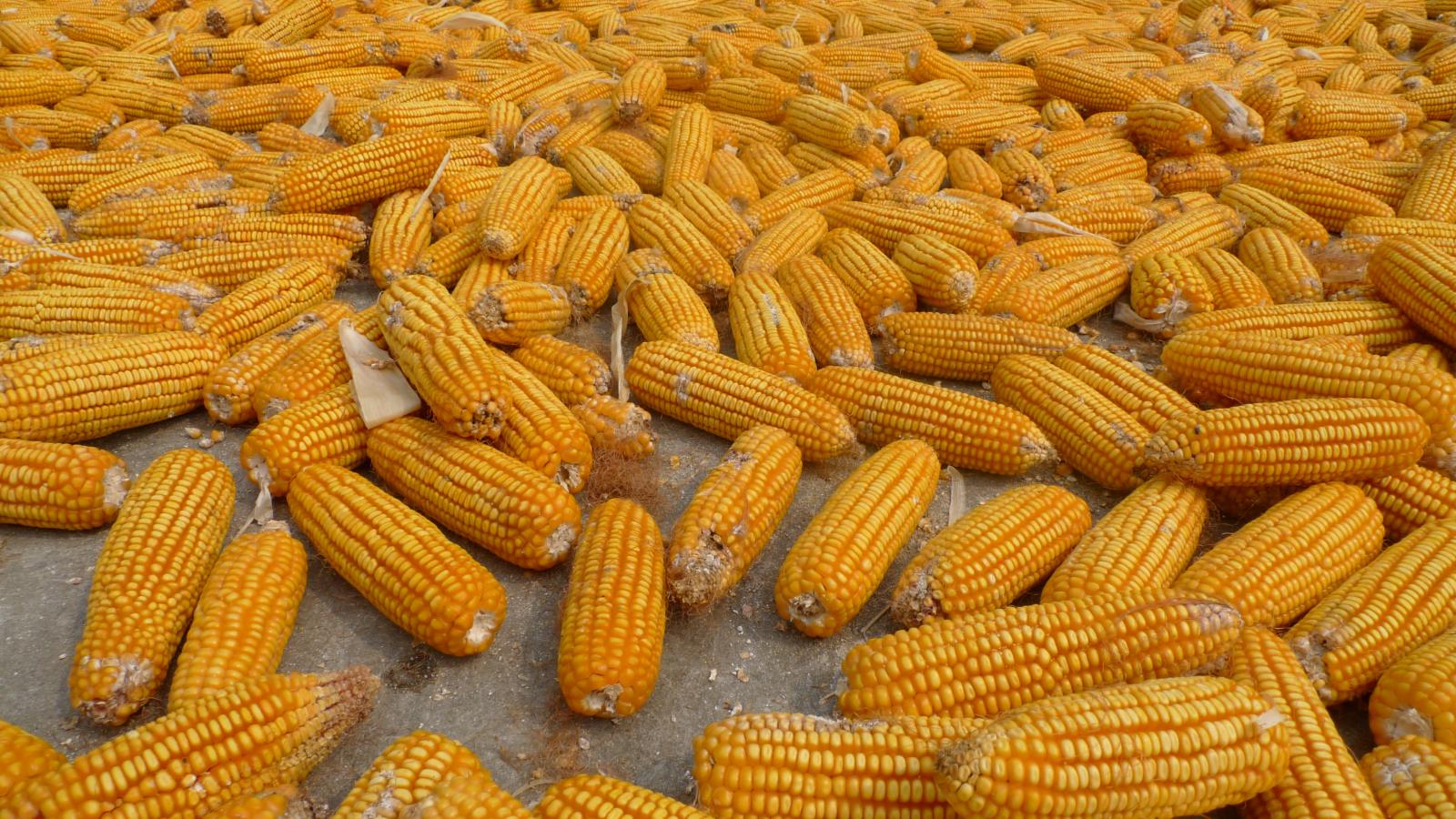 Обои Желтые початки кукурузы с зелеными листьями на столе