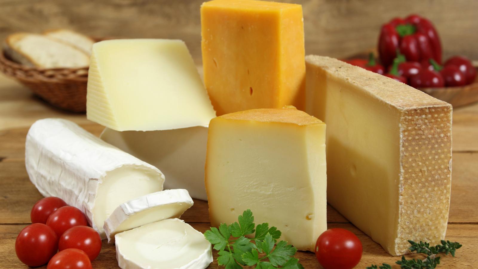 Обои Разные виды твердого сыра на столе с помидорами и петрушкой