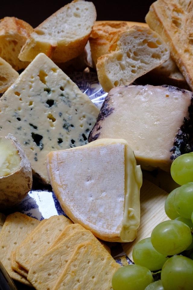 Обои Разные виды твердого сыра на тарелке с белыми виноградом и вином