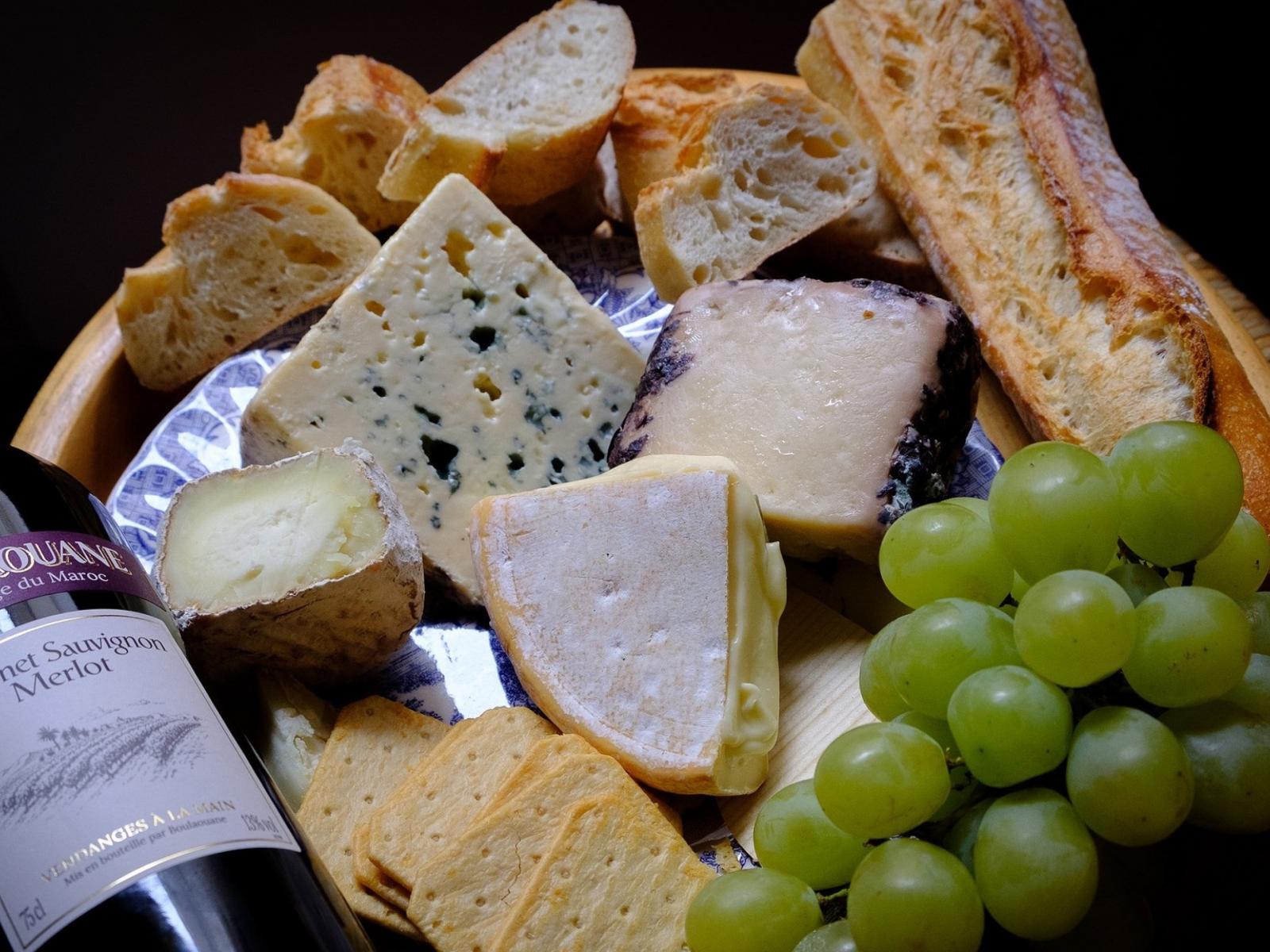 Обои Разные виды твердого сыра на тарелке с белыми виноградом и вином
