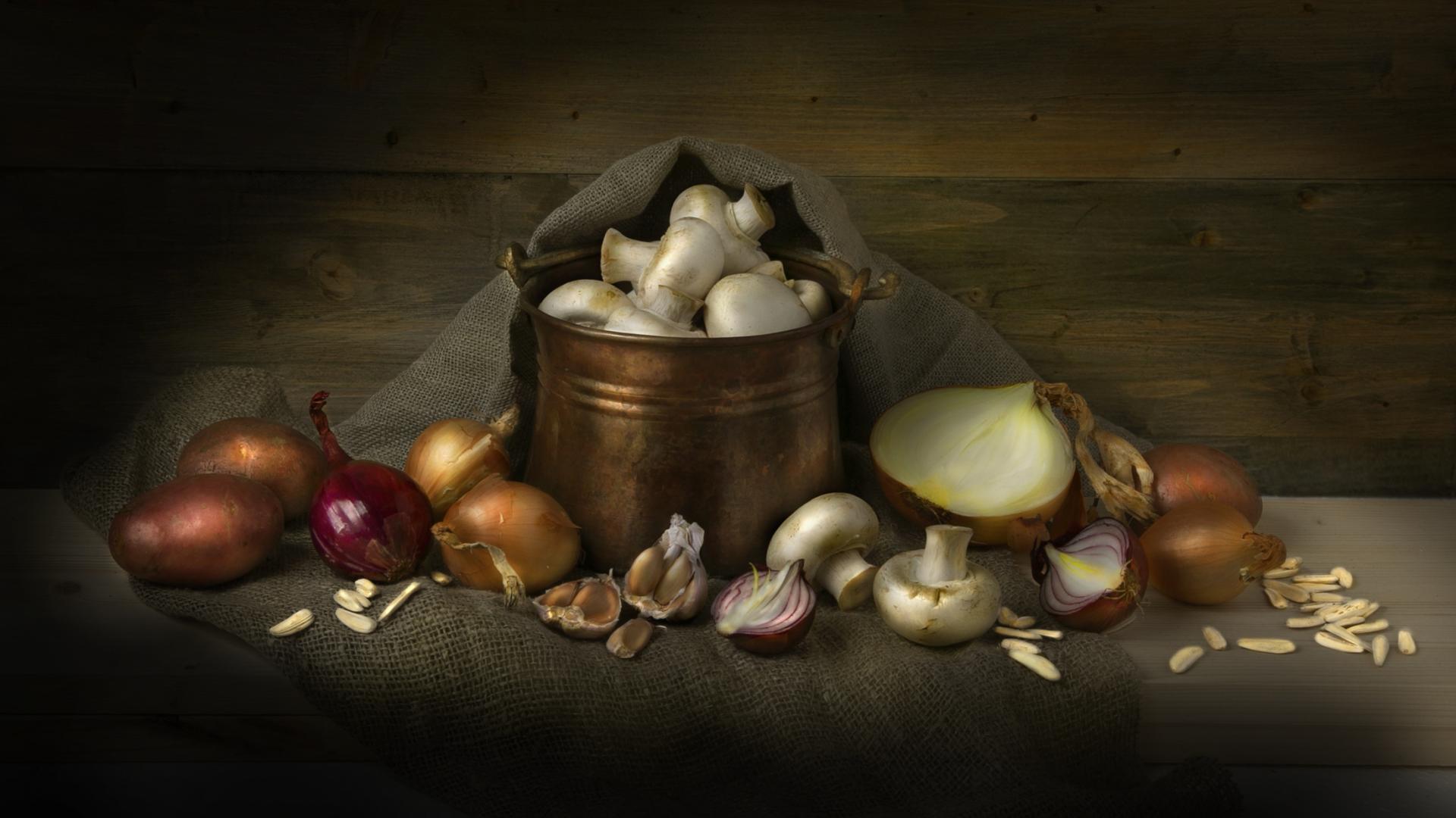 Обои Картофель, лук, чеснок и шампиньоны на столе
