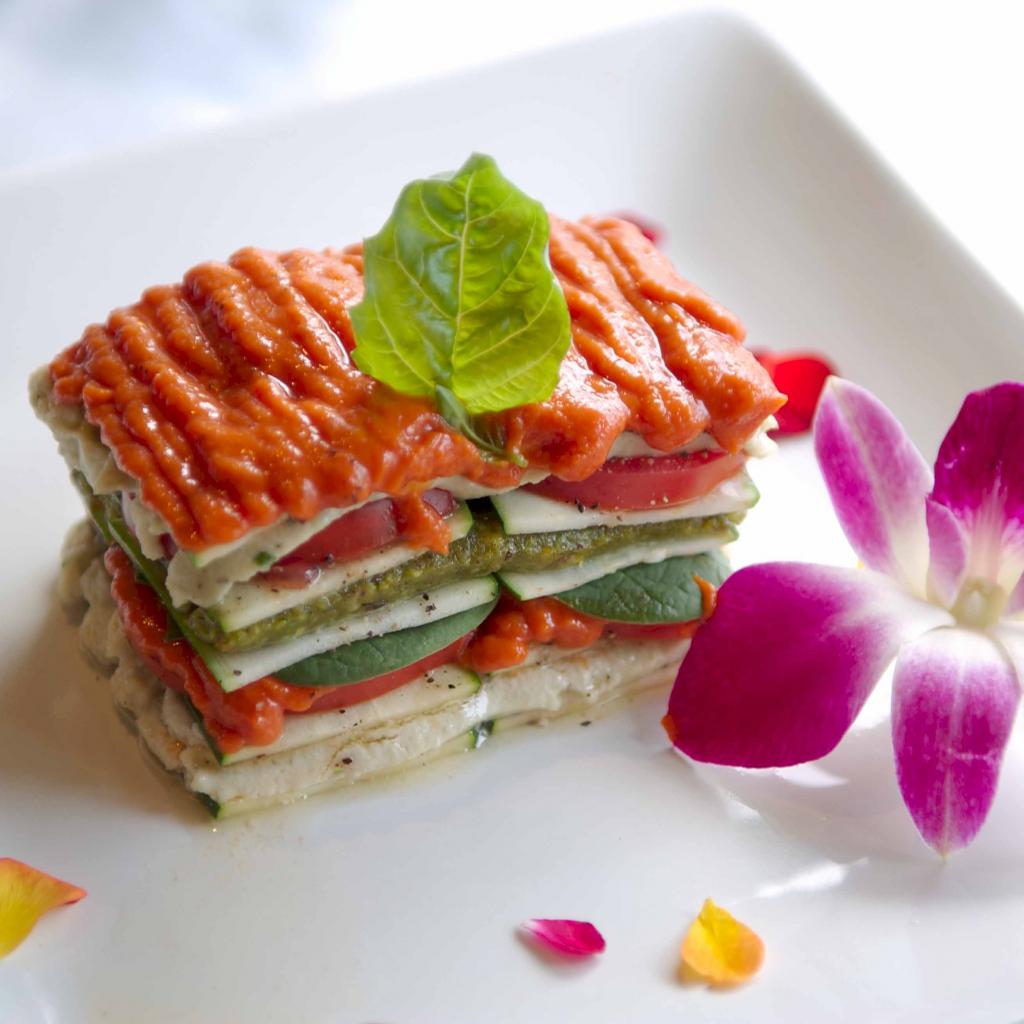 Обои Лазанья на белой тарелке с розовым цветком