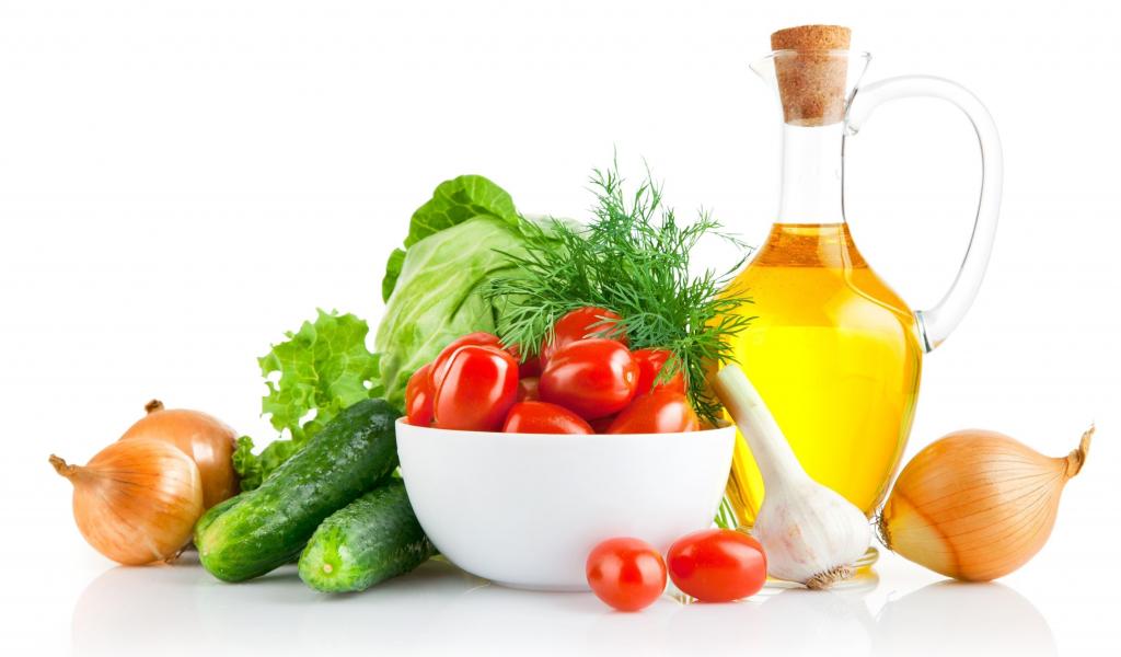 Обои Свежие овощи на столе с оливковым маслом на белом фоне