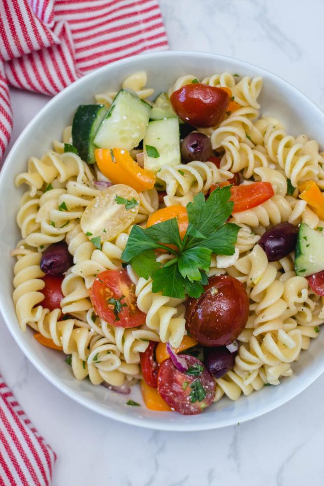 Обои Макароны в тарелке с овощами на столе