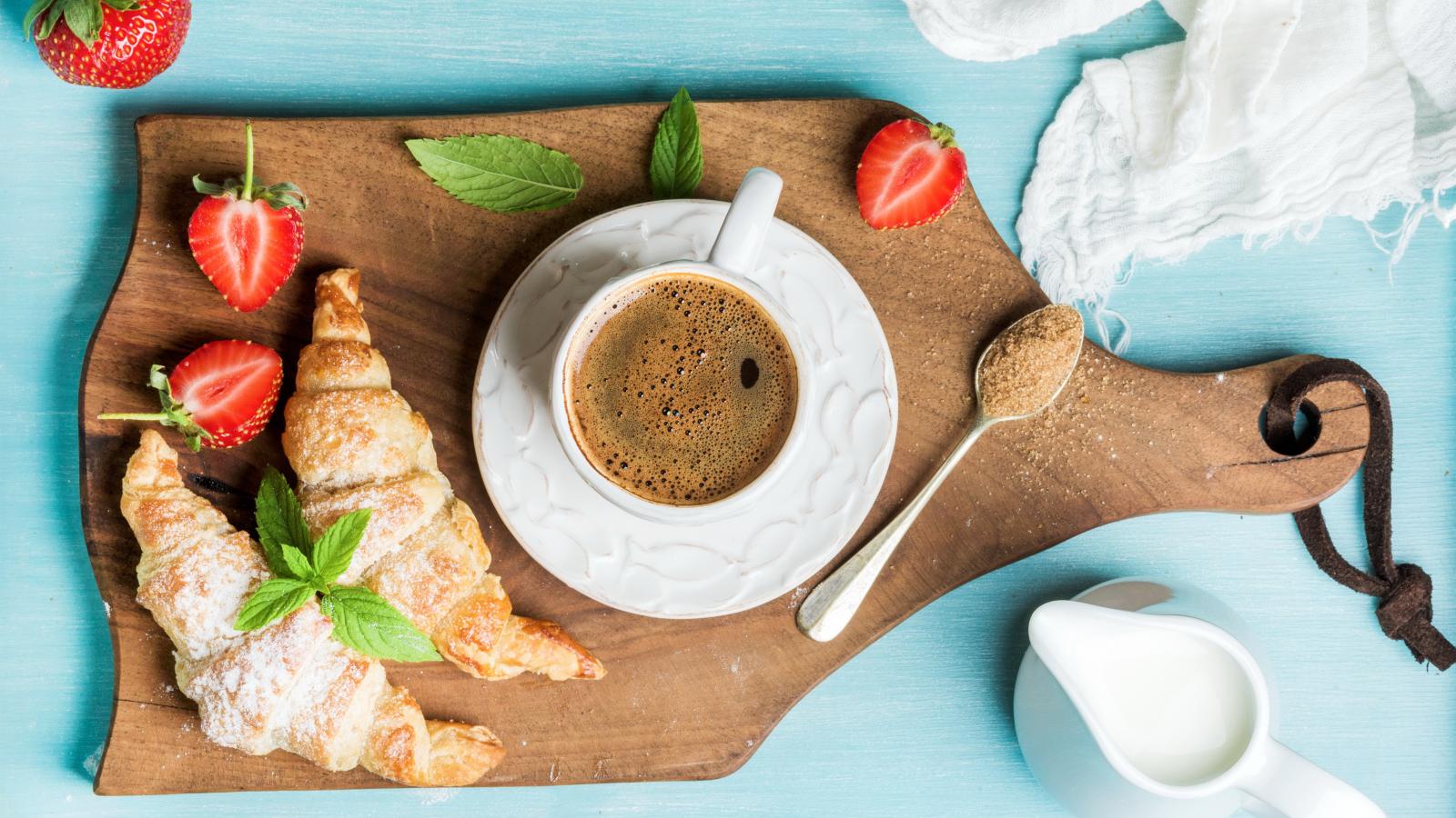 Обои Чашка кофе на доске с клубникой и круассанами