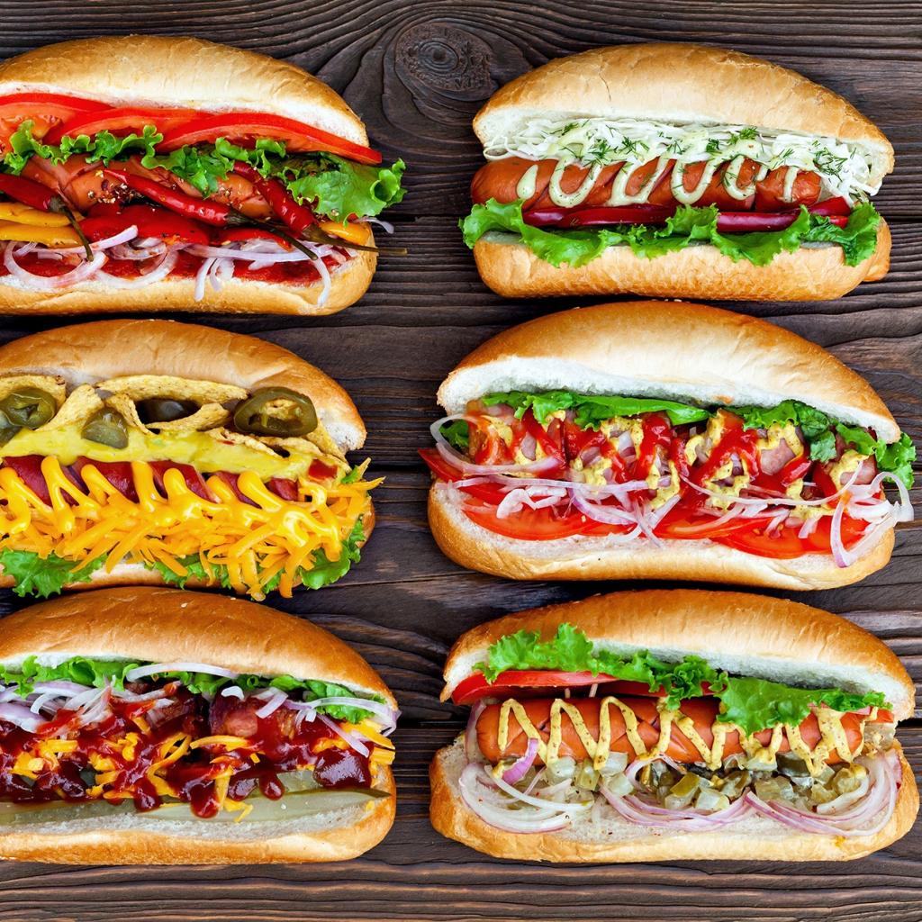 Обои Вкусные хотдоги на деревянном столе