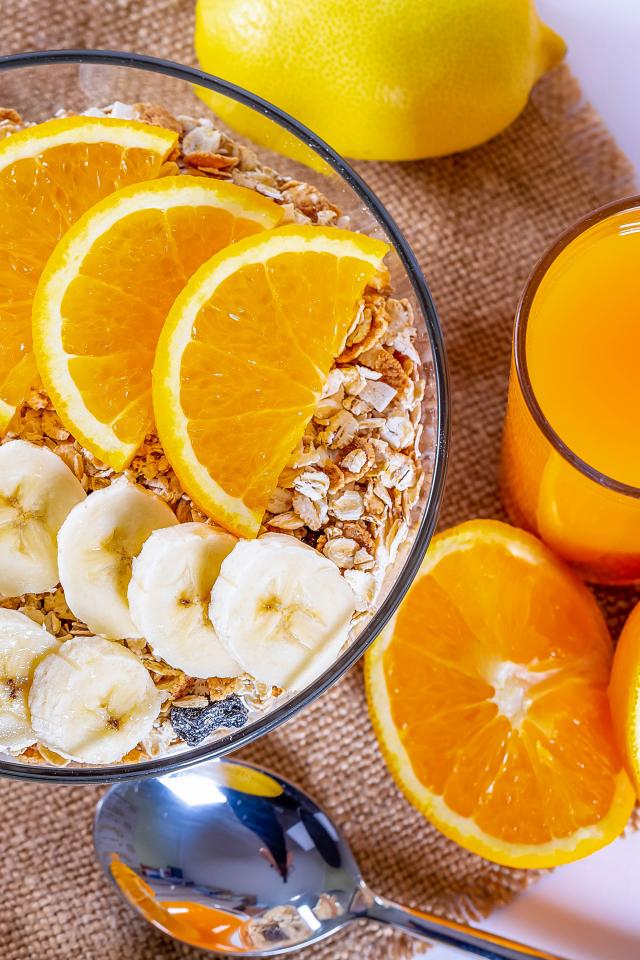 Обои Овсяные хлопья в тарелке с кусочками банана и апельсина на столе с соком