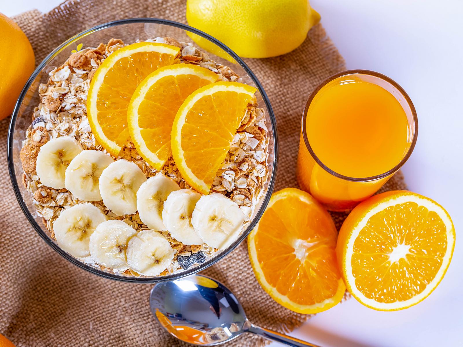 Обои Овсяные хлопья в тарелке с кусочками банана и апельсина на столе с соком