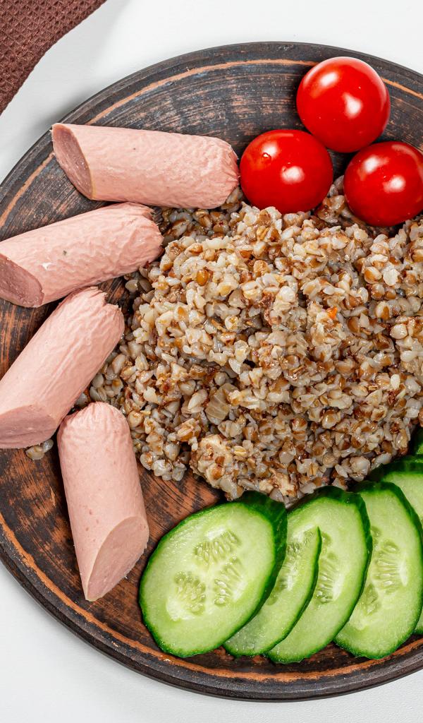 Обои Гречка на тарелке с помидорами, огурцами и сосисками