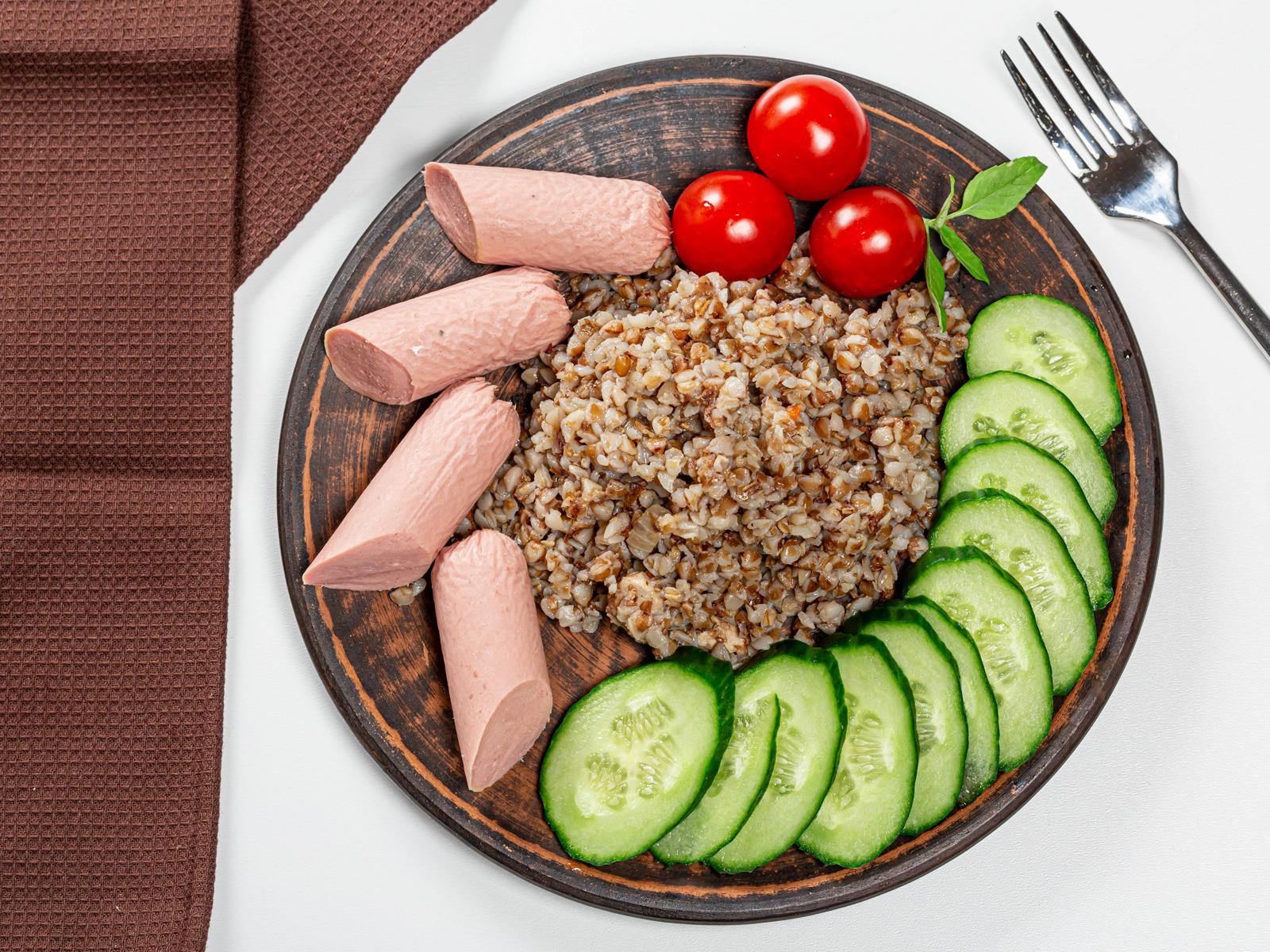 Обои Гречка на тарелке с помидорами, огурцами и сосисками