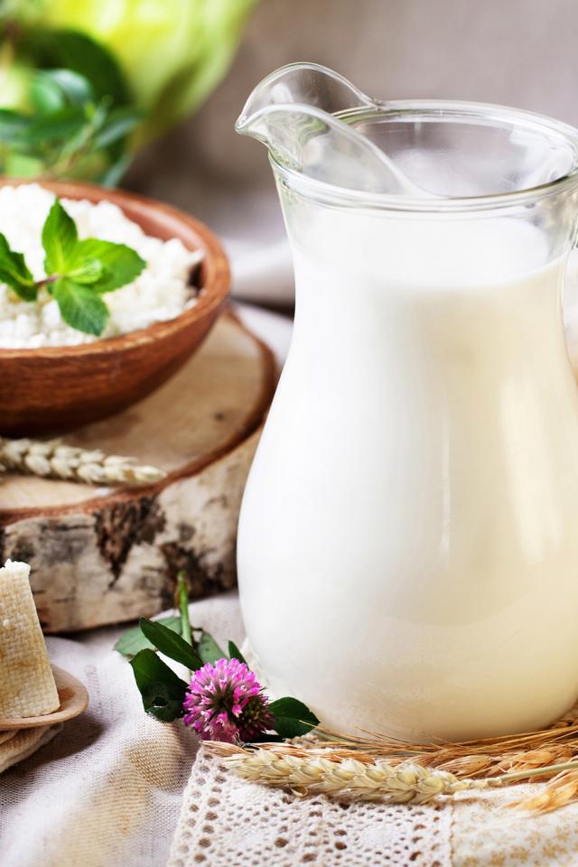 Обои Кувшин с молоком стоит на столе с сыром и творогом