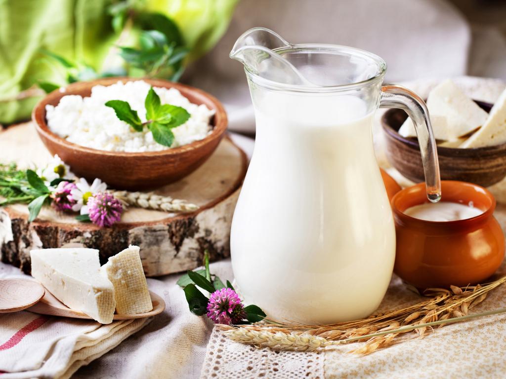 Обои Кувшин с молоком стоит на столе с сыром и творогом
