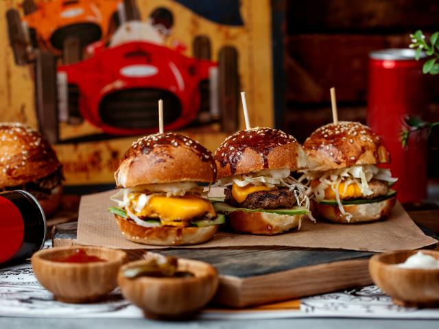 Обои Вкусные гамбургеры на столе с соусом и кока колой
